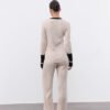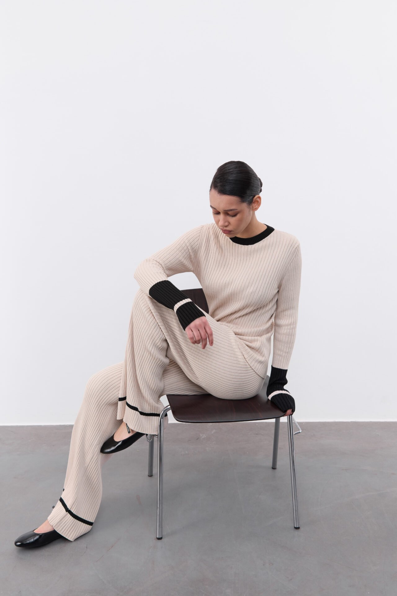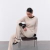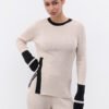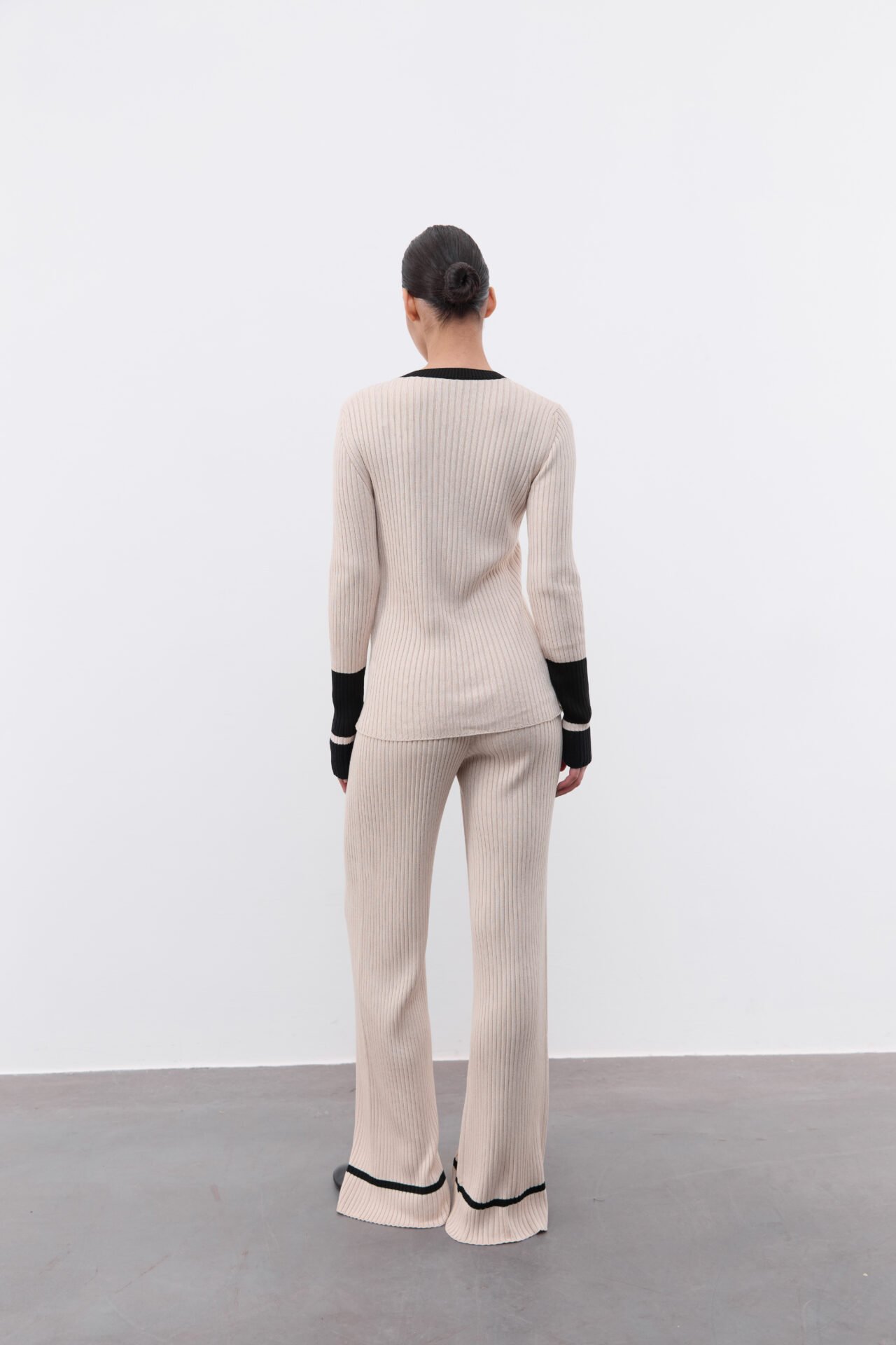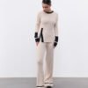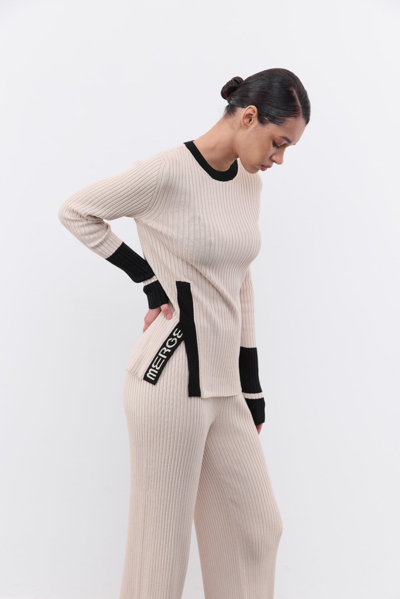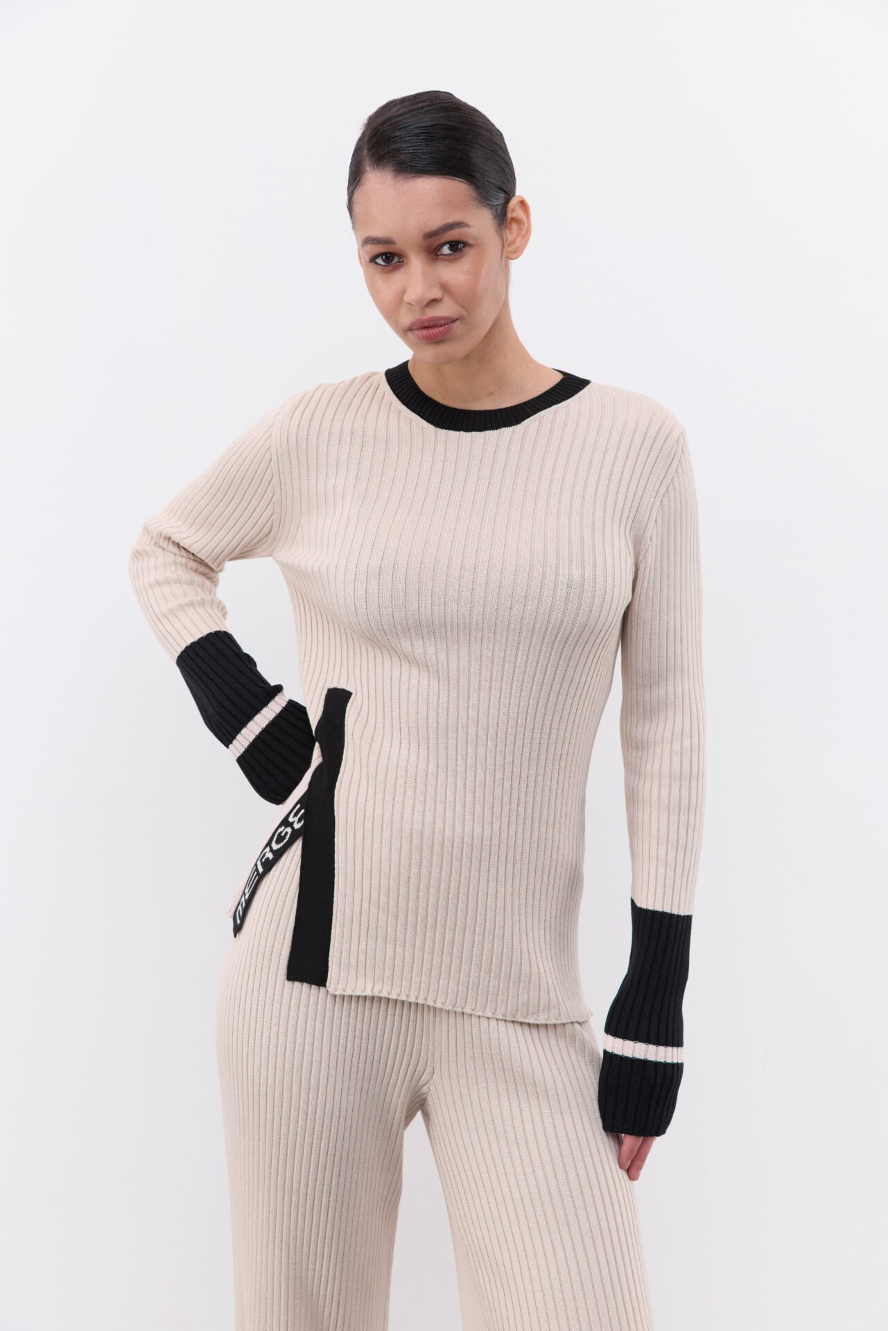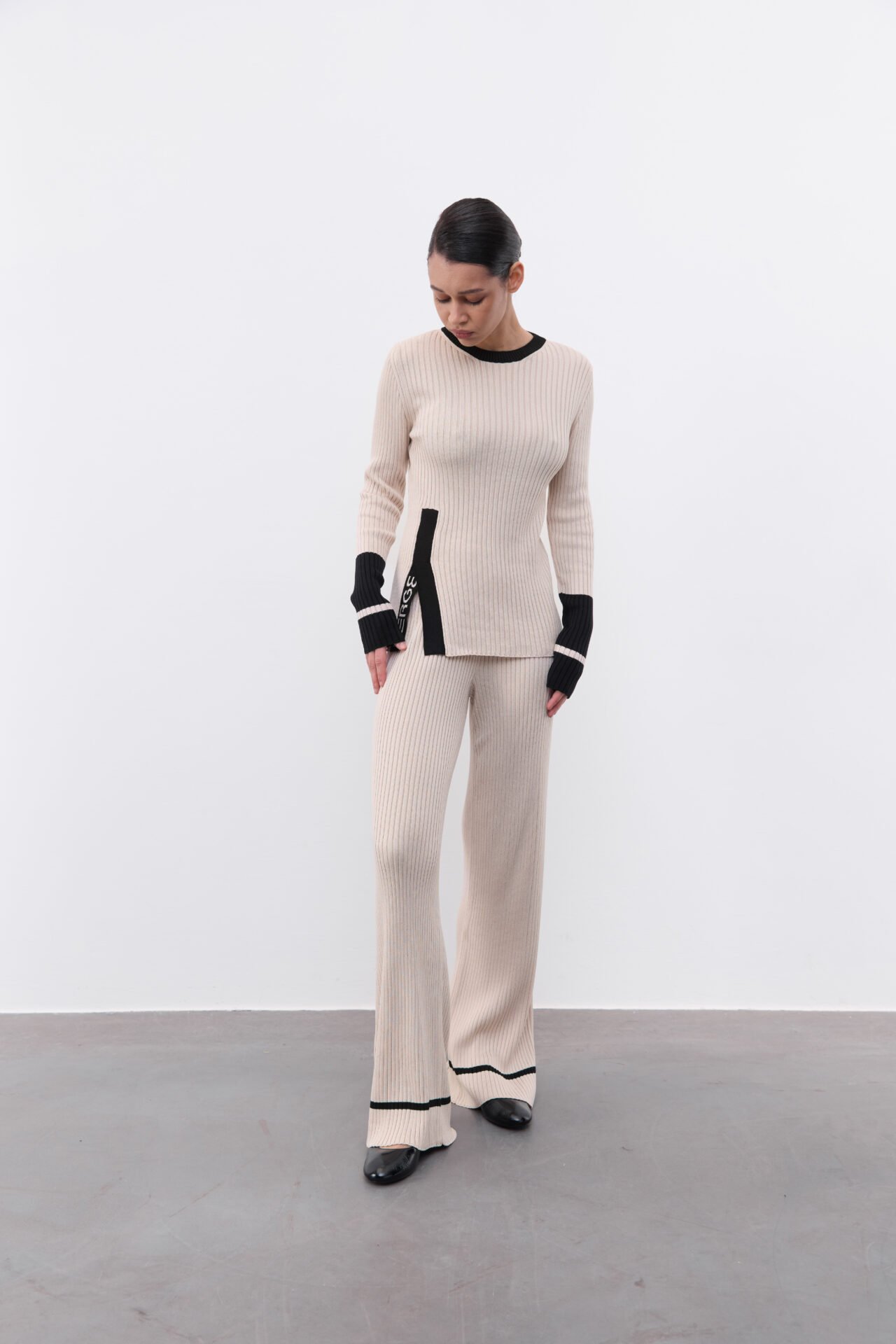 Костюм з декоративною брендовою розпіркою, оздоблений акцентним рукавом. Лонгслів має силуетний крій та трішки подовжений рукав , а штани-палаццо мають високу посадку та резинку , яку регулюємо згідно з обʼємами талії клієнта. Довжину штанів підбираємо під зріст (у коментарі до замовлення зазначте Ваш зріст).