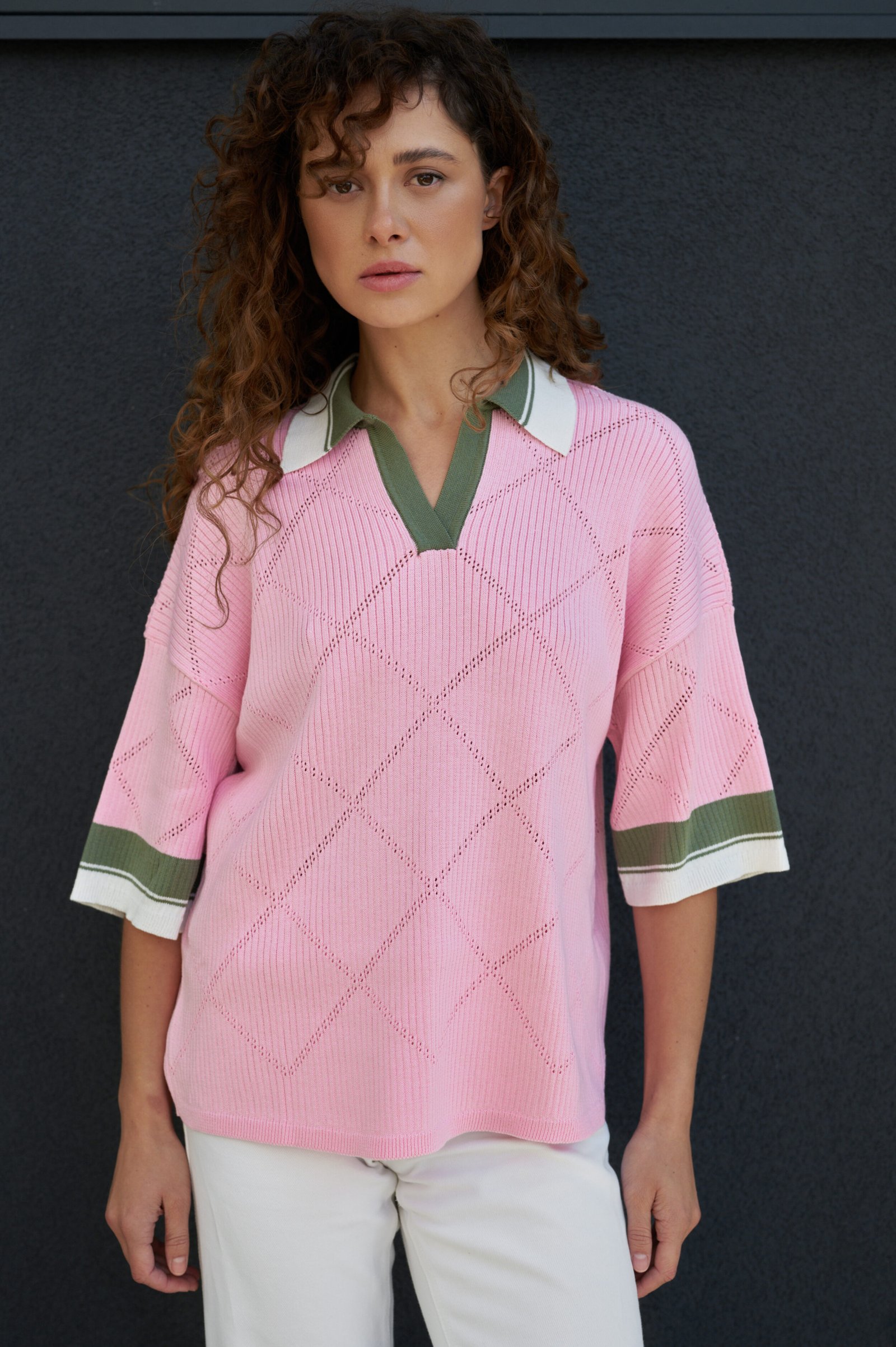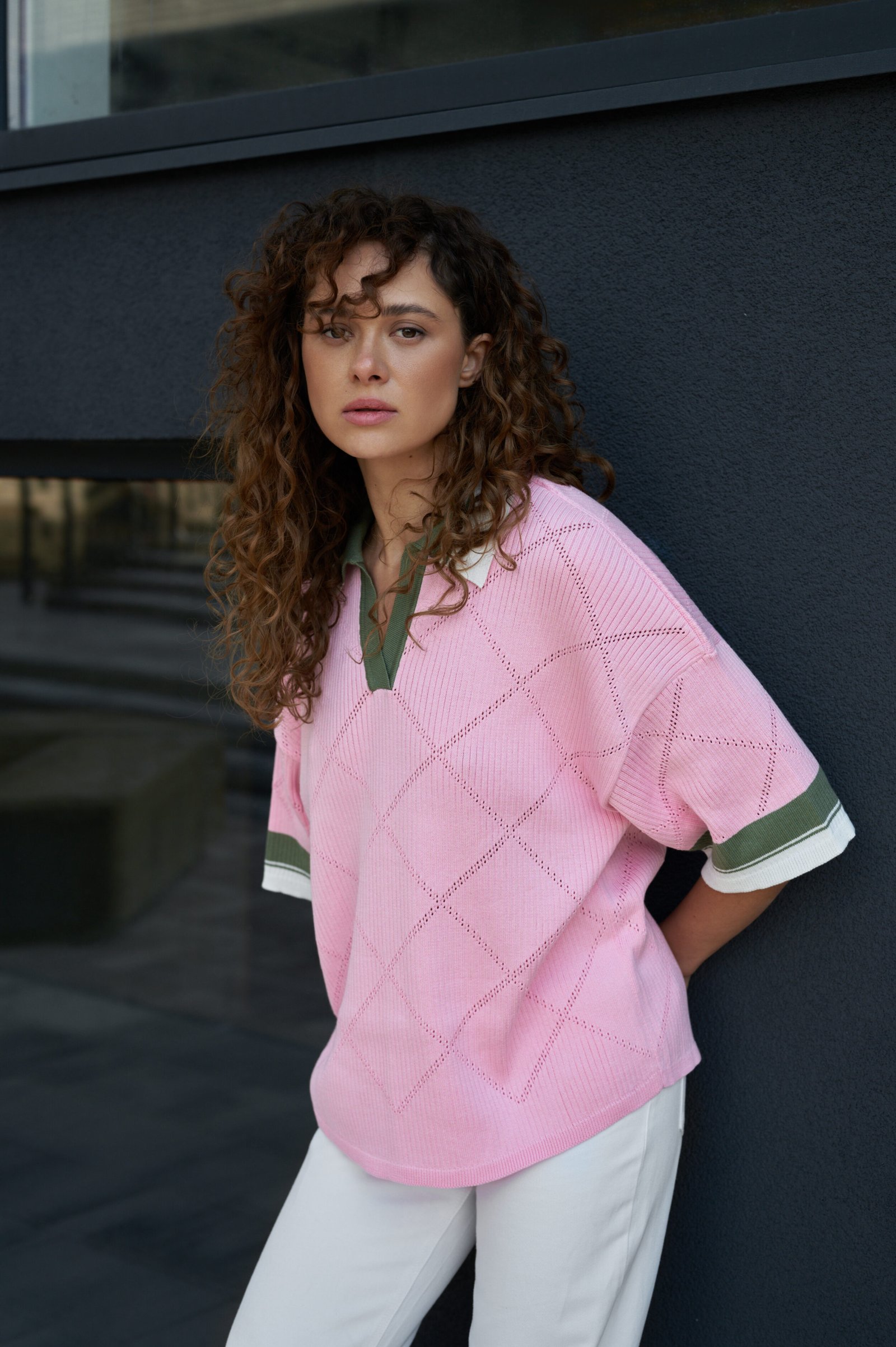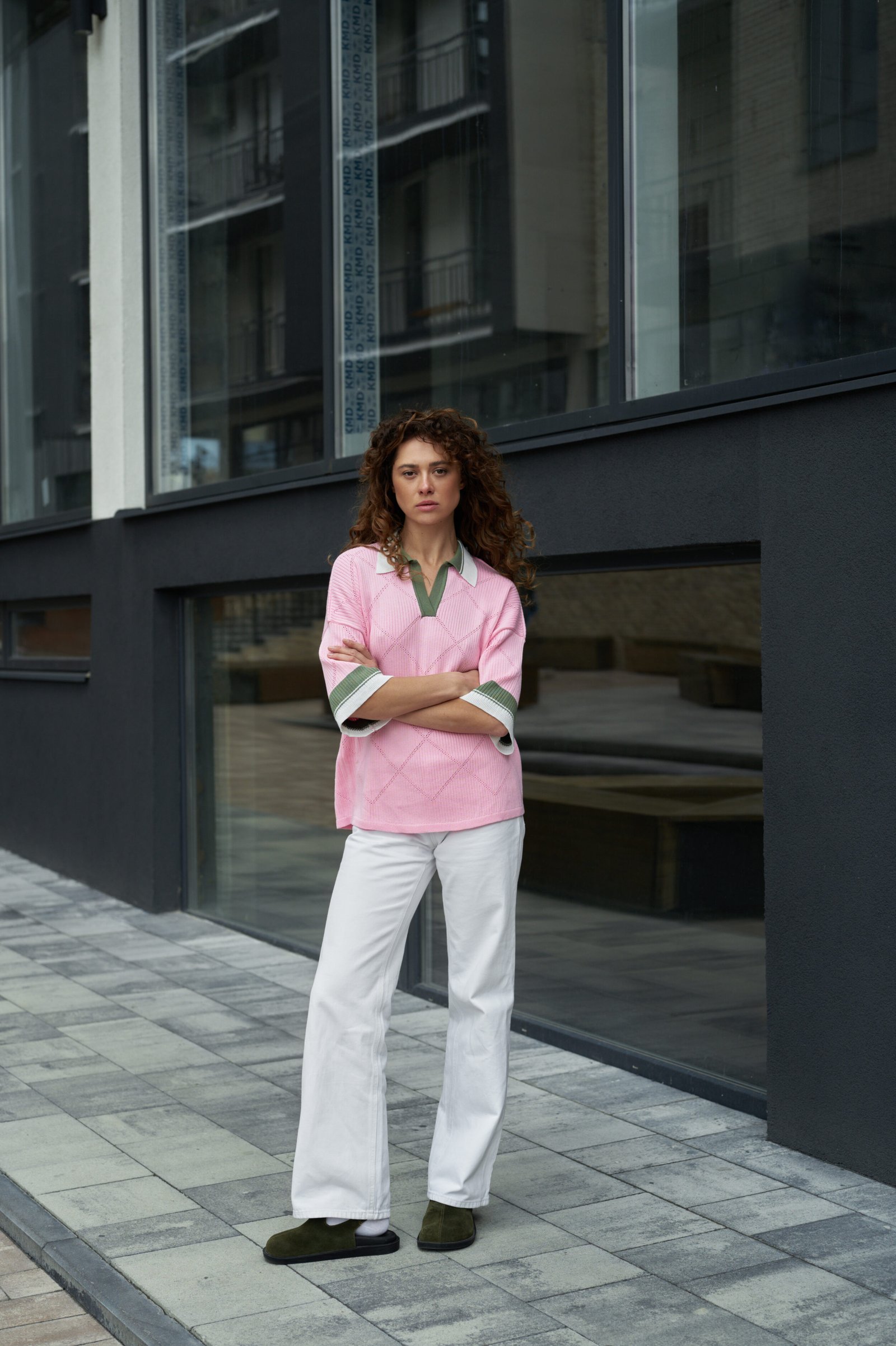 Поло «Ромб» – ідеальний варіант для тих, хто полюбляє поєднувати стиль та комфорт. Завдяки вільному крою ця модель чудово сідає на різні типи фігур. Поло має подовжений рукав та оригінальний візерунок у вигляді ромбів. Контрастні лінії на краях додають образу цікавого акценту. Поєднуйте його з джинсами, спідницею або штанами-палацо. Завершіть образ зручними кросівками, лоферами чи клогами.